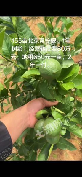 该土地位于海南儋州,土地性质为园地,面积:153.40亩,价格为:650元/亩/年,2年一付。每5年地租递增50元每亩。水电交通便利,设施设备完善。可流转20年;北京青柠檬树龄1年,现已开花结果。转让费用80万元。