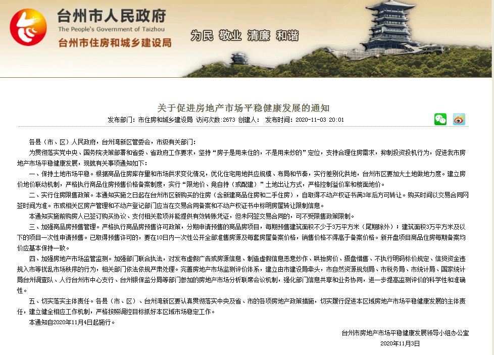 1月3日晚间,浙江省台州市住房和城乡建设局发布《关于促进房地产市场平稳健康发展的通知》(下文简称《通知》),规定浙江台州新购买住房3年内不得交易!那么,具体怎么回事?附政策全文!