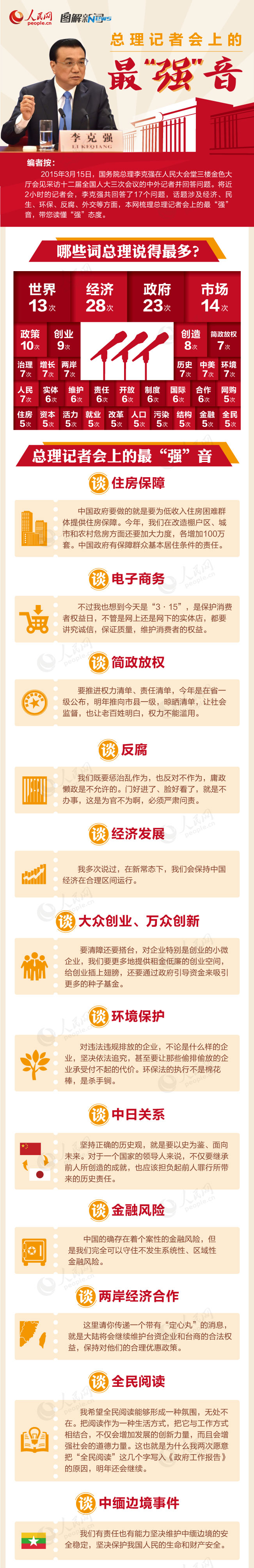 昨日上午,十二届全国人大三次会议闭幕后,国务院总理李克强在人民大会堂三楼金色大厅与中外记者会面,并回答记者提问。今年的记者会上,共有17位记者提问,其中8个问题与经济有关,其他问题涉及环境治理、简政放权、反腐、台湾问题、中日关系、中缅边境局势等。
